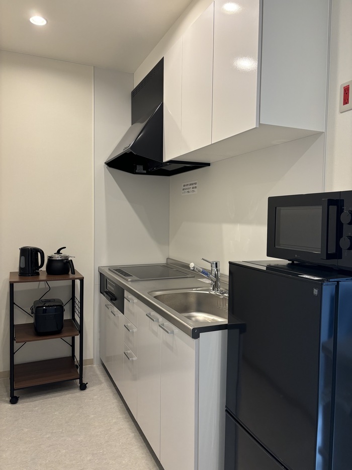 - 冷蔵庫、電子レンジ、炊飯器、電気ケトル、テレビ、洗濯機、掃除機、ベッド(2台)、ソファーセット、机、イス(2脚)